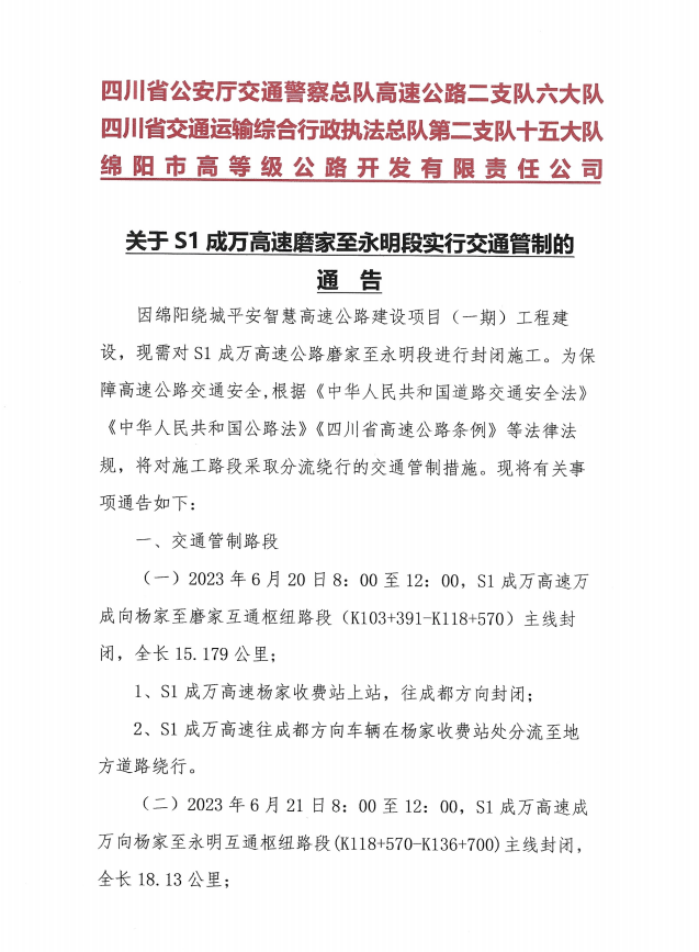 關(guān)于S1成萬高速磨家至永明段實行交通管制的通告