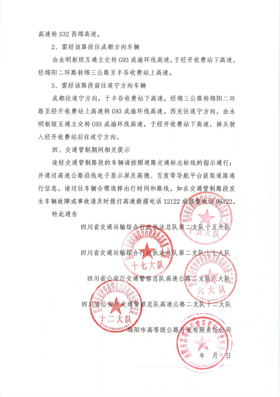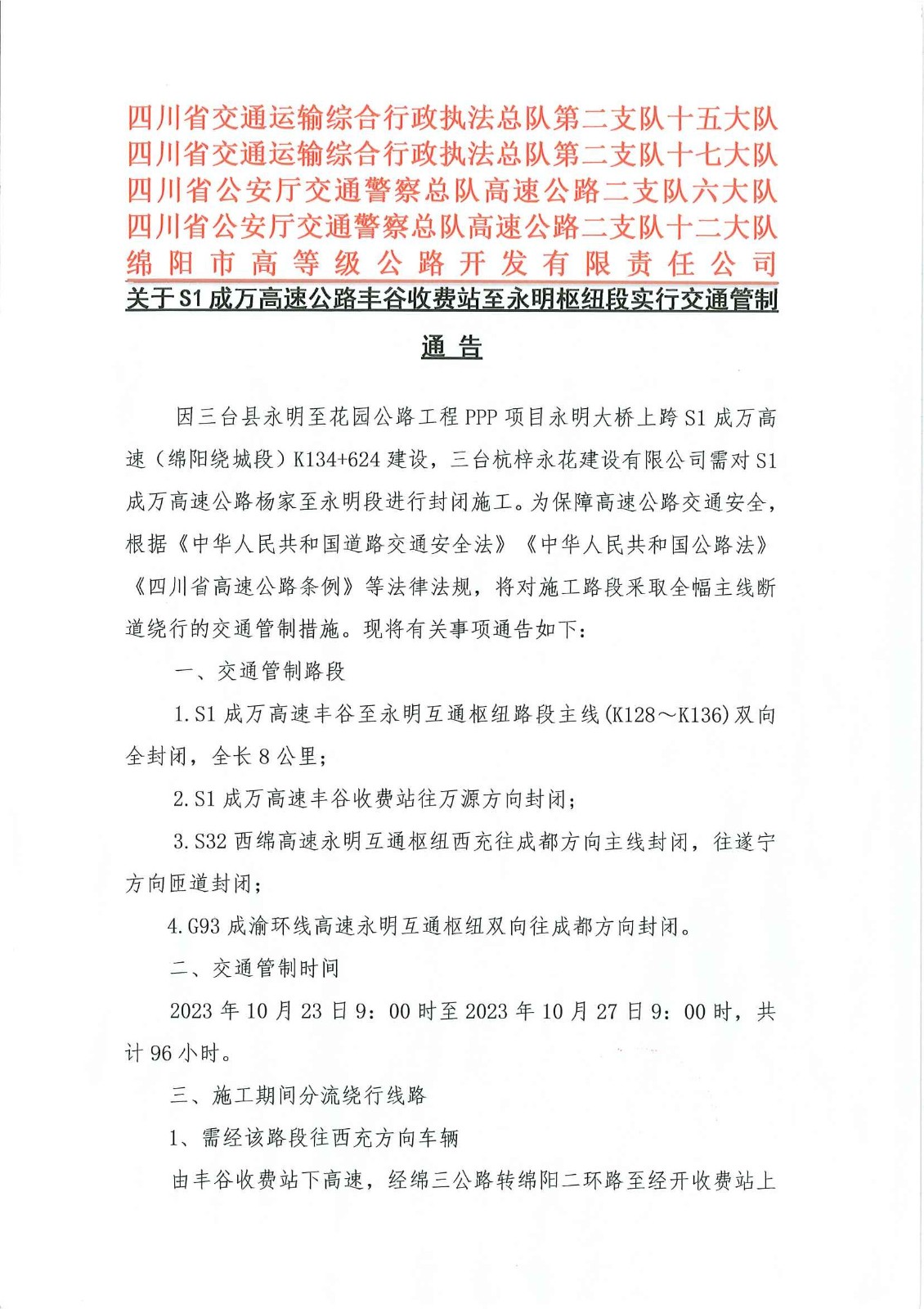 關(guān)于S1成萬(wàn)高速公路豐谷收費(fèi)站至永明樞紐段實(shí)行交通管制通告