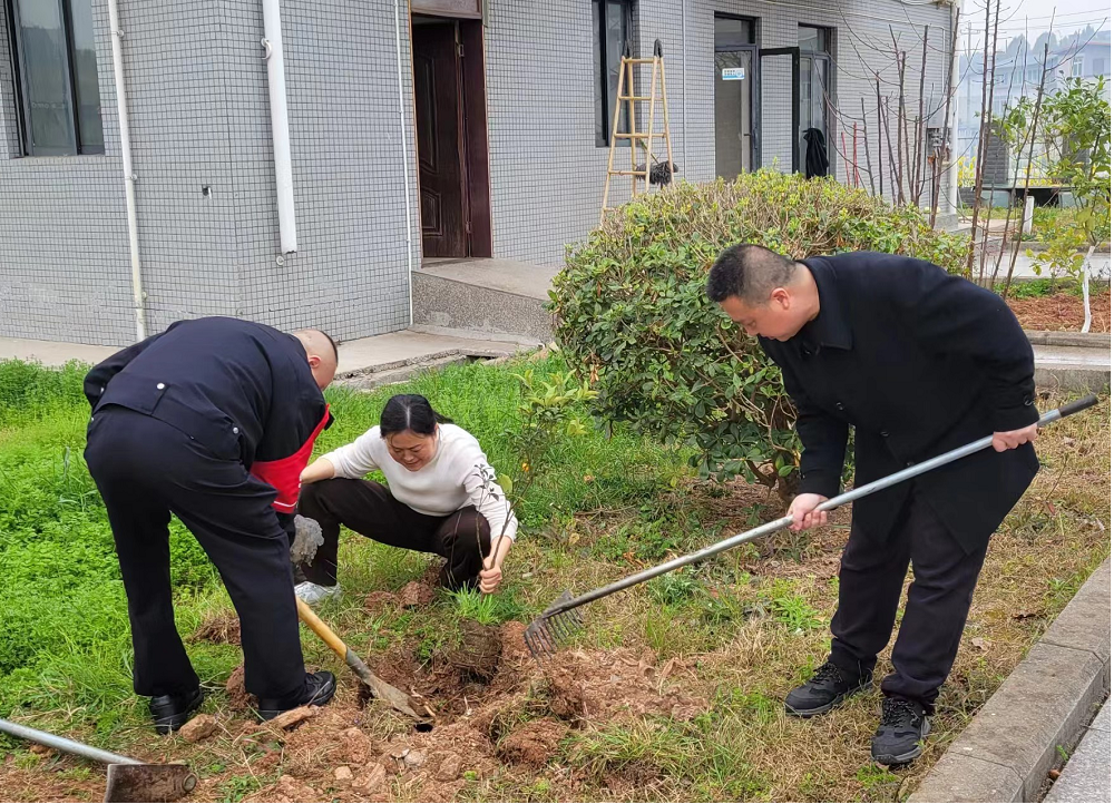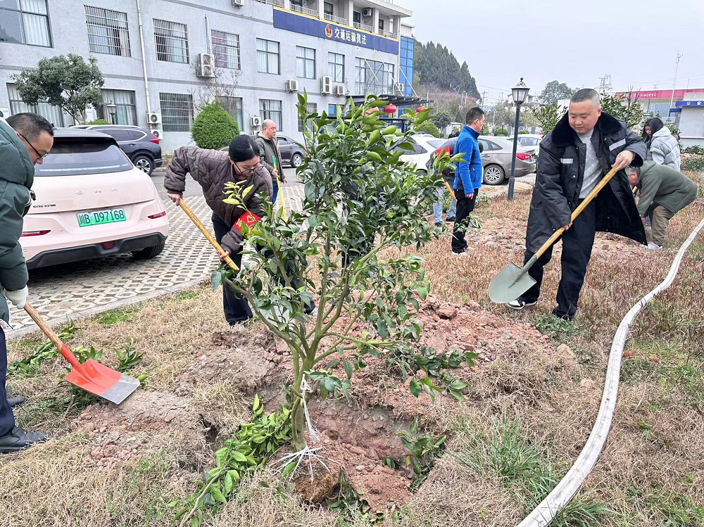 在植樹現(xiàn)場,大家三五一組,揮鍬鏟土、扶苗填坑、各司其職,合力栽下了一株株樹苗,處處呈現(xiàn)出一派熱火朝天的忙碌景象。經(jīng)過一上午的辛勤勞動,30多株柑橘、金桔等樹苗在自己的屬地“安家落戶”,把原本一片空草地裝點的生機盎然,形成了一道亮麗的風(fēng)景線。